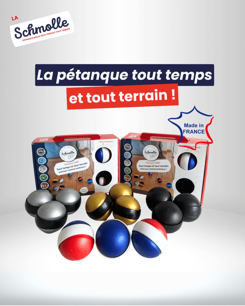 craftsmanship. Its unique composition ( a flexible plastic shell with an internal core of steel beads ) ensures safe play without damaging floors or surroundings, while preserving the authentic feel of a traditional pétanque game. Suitable for all ages, La Schmolle appeals to families and businesses alike, offering both a fun leisure activity and an original, sustainable gift idea. Customizable (colors, engravings, logos), it embodies the spirit of a durable, unifying, and truly French game.